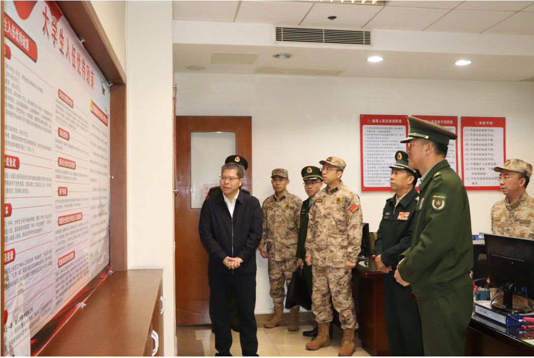 12月23日上午,省军区领导祁建国、方杰伟、李兵希一行到道滘镇调研武装工作。在市委常委、东莞军分区领导张彬,东莞军分区相关领导艾登科、张超,道滘镇党委副书记吴炽谦,镇党委委员、武装部相关负责人袁文志的陪同下,调研组实地查看了武装部办公室、党支部会议室等阵地建设,查阅了相关工作资料,认真听取了道滘镇关于武装工作全面建设的情况汇报,详细了解了道滘武装部规范化建设情况。