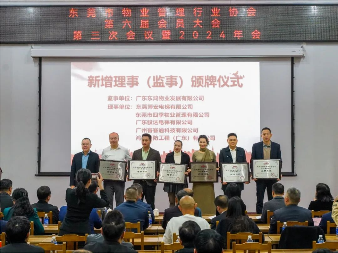 大会还审议了新增理事(监事)单位的事宜,并表决通过了新增广东东鸿物业发展有限公司为第六届监事单位,东莞博安电梯有限公司、东莞市四季物业管理有限公司、广东骏达电梯有限公司、广州客客通科技有限公司、鸿海消防工程(广东)有限公司为第六届理事单位,并为其举行了授牌仪式。