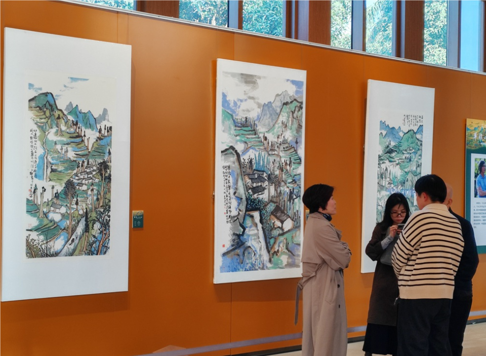 此次画展,共邀请林容生、许俊、岳增光、袁学君、张建京和杨惠东六位国内知名的画家。他们以笔墨为舟,以色彩为帆,引领参展观众穿梭于青绿山水之间,领略山水之美、自然之妙。展览共呈现83幅作品,或尺幅小品,或宏幅巨制,涵盖工笔重彩、小青绿、大青绿等多种技法,展现了青绿山水画丰富表现力与艺术魅力。开展仪式结束后,馆内还进行参展画家和嘉宾笔会活动,嘉宾移步至展厅内交流、欣赏展出作品。青绿山水,作为中国传统绘画的重要流派,以其对山水自然的独特描绘和艺术表达,成为了展现绿水青山之美的绝佳艺术形式。展出的部分作品或山峦叠翠,云雾缭绕,墨色与石色交融,展现出清新雅致格调;或以硬朗线条勾勒山势,色彩明快,给人以雄浑壮阔之感;抑或是笔尖勾勒出潺潺溪流与繁茂植被,尽显生命蓬勃力量。画家们以各自独特的绘画风格和艺术视角,创作一幅幅精彩纷呈的青绿山水画卷,为观众带来了一场精彩的文化盛宴。中国美协河山画会秘书长杨惠东:“在中国的文人的心目中,人和山水是一体的,是相通的,我们作为传统的中国画家,在致力于这种青绿山水的艺术探索中,毫无疑问的要走向大自然,与祖国的壮丽河山亲密接触,从而获得灵感,丰富我们的画笔和创作。”