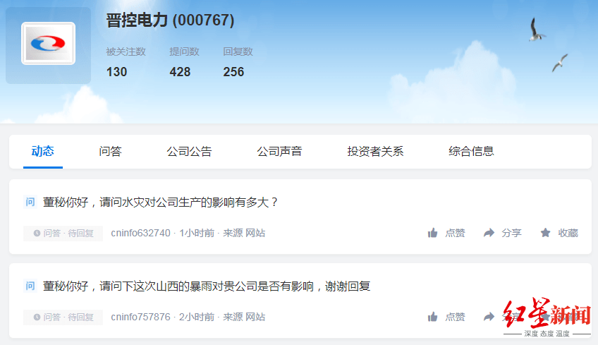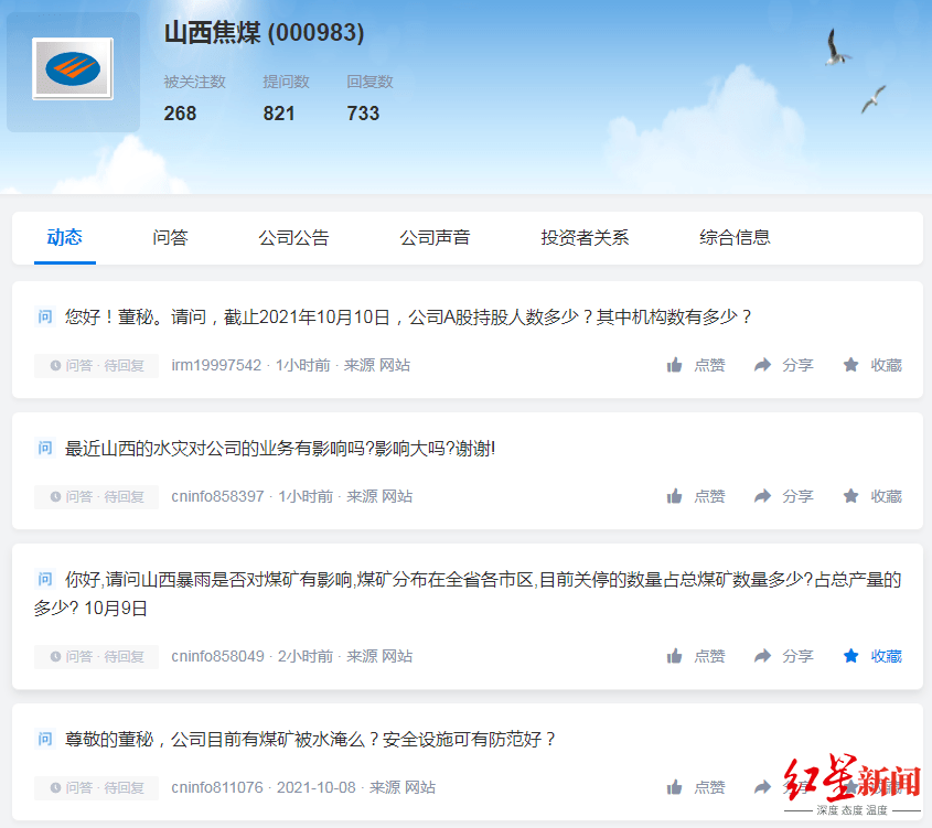 最近几天,在互动平台,山西焦煤(000983.SZ)、晋控电力(000767.SZ)、美锦能源(000723.SZ)、山煤国际(600546.SH)等上市公司股民也开始询问煤炭业务相关问题。但未有公司在平台回复留言。