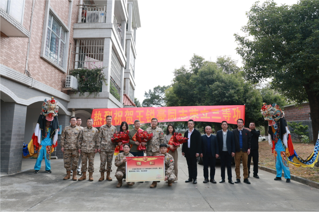 1月15日,清溪镇镇领导、武装部部长谢文达一行来到荔横村现役军人王锐豪家中进行走访慰问,代表镇委、镇政府祝贺现役军人王锐豪在部队表现优异,荣立三等功,并为其家属送去了立功喜报和慰问金。在铿锵的锣鼓声中,灵动的麒麟开路。慰问组一行等带着立功喜报,高举庆祝横幅走进现役军人王锐豪家中,为军属们系上绶带,送去新春慰问,对他们培养出了优秀的军人表达敬意,感谢家属一直以来对部队、对国防事业的大力支持和默默付出。