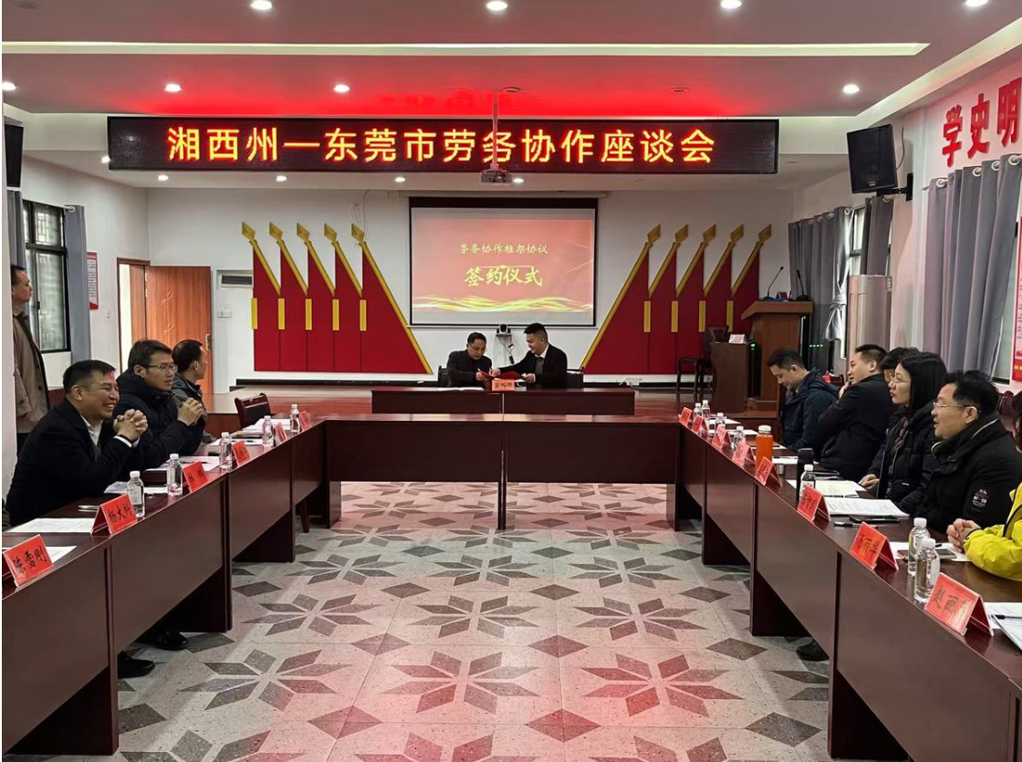 2月5日上午,东莞与湘西两地人社部门在凤凰镇举行劳务合作工作座谈会。东莞市人社局党组书记、局长陈智武对湘西州的支持表示感谢,并介绍了东莞的经济、就业和生活情况,希望两地能借此机会建立稳定的劳务合作机制。湘西州人社局副局长杜鹏介绍了该州的“20200”劳务协作计划,未来5年将确定20个重点城市作为劳务协作核心基地,东莞正是其中之一。会上,两地人社局签订了劳务合作协议,湘西州凤凰县廖家桥镇也与东莞人力资源机构广东先峰人集团有限公司签订了人力资源合作协议。