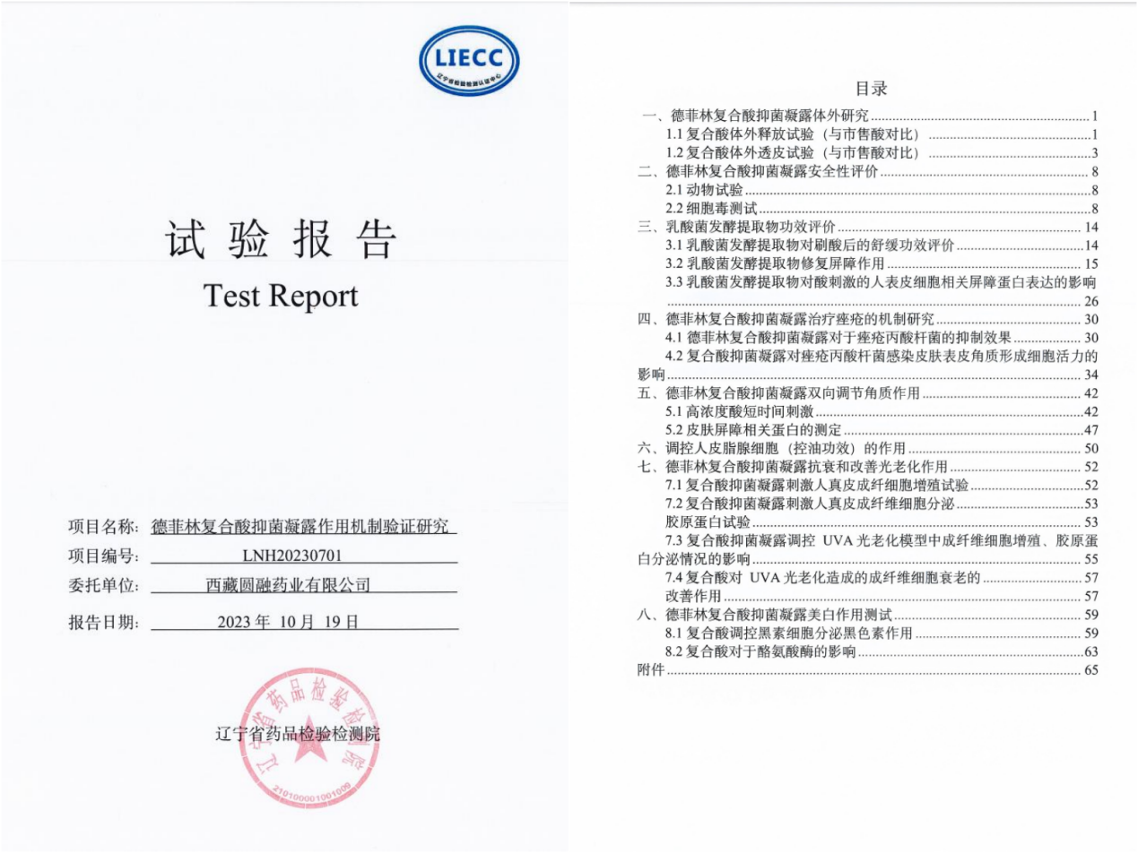 有了专业和实践的基础,德菲林产品实力突飞猛进。德菲林重点品-复合酸抑菌凝露(E生酸)作用机制验证研究表明,复合酸细胞毒性、细胞渗透、皮肤刺激性和安全性等方面得到了完美验证,同时,通过对复合酸对痤疮丙酸杆菌抑制、抗炎、控油、抗衰老和美白等多方面功效验证,用实验科学成果和数据,论证德菲林复合酸在临床应用效果呈现优势。