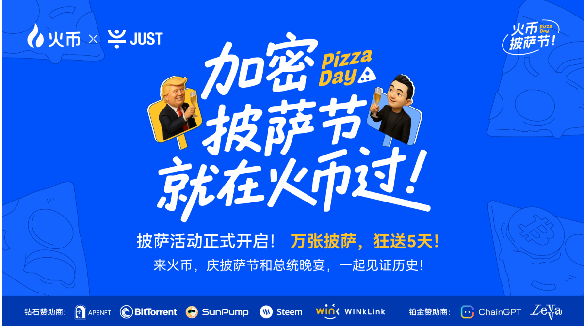 5月22日,加密市场将迎来双重盛事——BTC披萨节与TRUMP晚宴同日上演,历史与现实交织,点燃全球关注!为庆祝这一特别时刻,HTX联合钻石赞助商JUST Protocol、SunPump、APENFT、BitTorrent、WINkLink及铂金赞助商Levva、ChainGPT于5月20日10时上线“加密披萨节,就在HTX过”聚合主题福利活动。