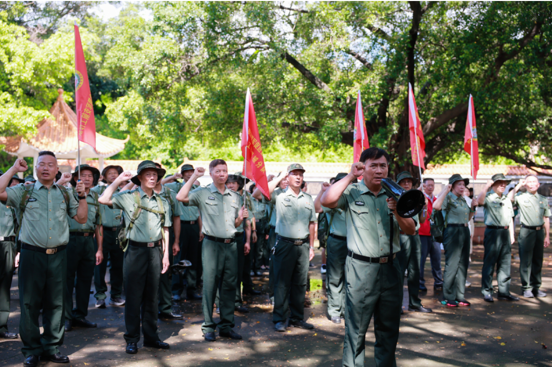 集训首站直抵东城温塘革命烈士纪念碑。全体队员肃立雨中,通过默哀致敬、敬献花篮等仪式追思英烈。东莞市爱国拥军促进会会长梁应昌的动员讲话穿透雨幕:"拥军支前是生命的接力!"他手指纪念碑告诫队员,"宁可备而不战,不可战而无备"——这场练兵正是对"若有战,召必回"誓言的淬火实践。陈沛东带领队员面向党旗重温入党誓词,"为共产主义奋斗终身"的誓言与纪念碑上的弹痕交相辉映。集训前特别安排的党的二十大精神专题学习,将红色基因融入练兵血脉,年轻退役军人在老兵的带领下郑重签署参训承诺书。