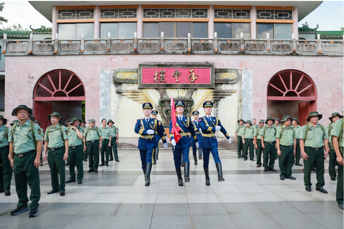 6月22日,广东观行研学实践教育营地上空回荡着铿锵口号,东莞市爱国拥军促进会组织的"铭记历史·强军有我"2025年度拥军支前常态化集训在此启动。120名以退役军人为主体的参训队员雨中列阵,在国歌声中注视6名三军仪仗队退役老兵组成的护旗方队正步踏过泥泞。随着拥军支前工作队总队长陈沛东将鲜红旗帜授予突击分队、工程机械分队、后勤保障分队、医疗救援分队及女兵分队,五面队旗在疾风中猎猎作响,宣告东莞社会化拥军力量"旗帜在手,使命在肩"的实战化练兵正式拉开帷幕。
