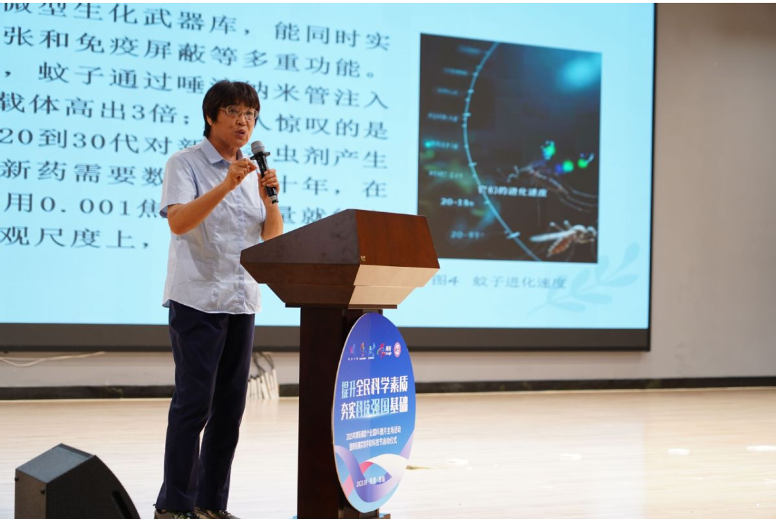 最受瞩目的科学实验表演秀带来了强烈的视觉冲击,如“液氮爆炸”实验和“火焰掌”表演,赢得了师生们的惊叹和欢呼。同时,东莞市科普讲师团成员高秀玲教授带来了《人蚊智斗》专题讲座,从蚊子的构造、吸血标准到防蚊妙招,让师生们发现科学就在身边。
