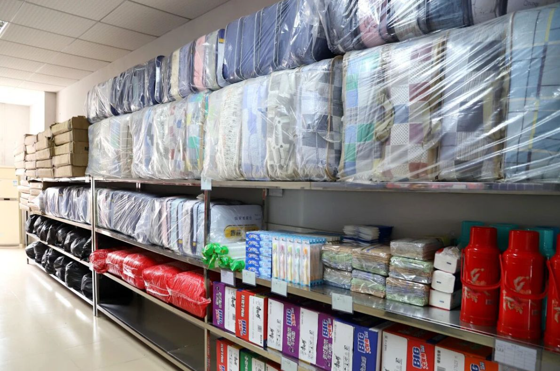 谢岗中学应急避难场所布置有序,划分为物资领取区、文娱活动区和集中用餐区,提供基本生活保障,并配备充足的被子、竹席等休息用品,营造舒适临时居住环境。