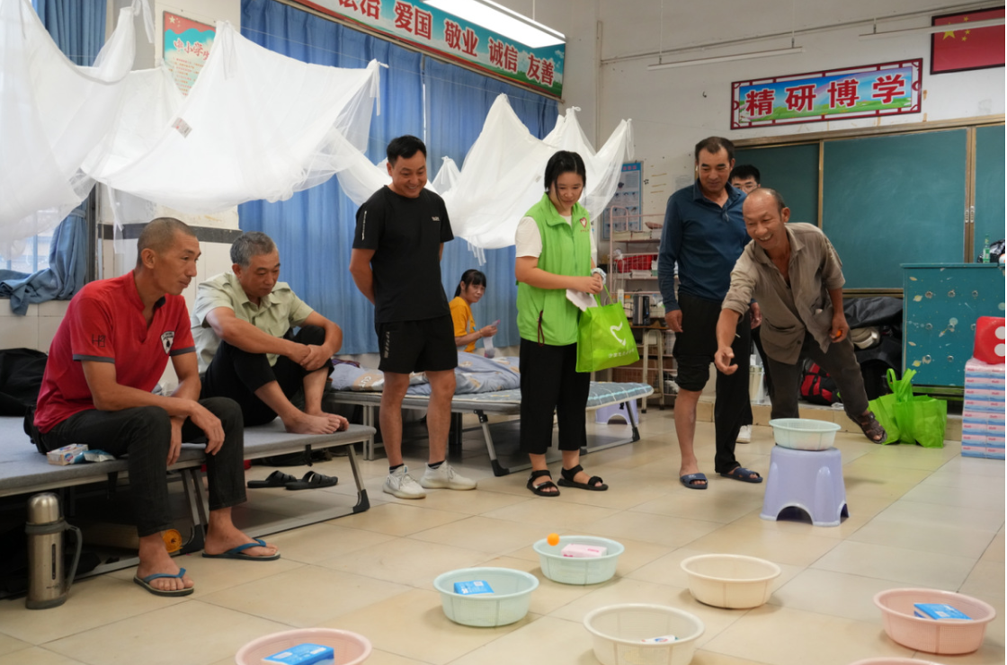在满足基本生活需求的同时,沙田镇还特别关注安置人员的精神状态和心理需求。在翠园小学安置点,志愿者们组织了多项互动游戏,如乒乓球投篮、丢骰子、防诈骗问答等。这些游戏道具简单,规则易懂,使得每个人都能够参与其中。所有游戏的奖品都是日常生活必需品,例如抽纸、香皂、牙刷等,这不仅增加了活动的趣味性,还帮助解决了部分群众在转移时未能带齐生活用品的问题。