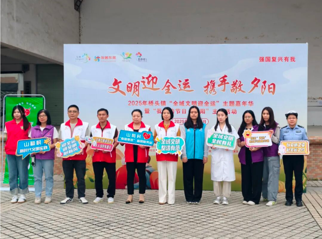 这两场活动虽发生于同一日,却从不同维度构建起桥头镇重阳节的文化图谱:一边是集宣传、服务、互动于一体的嘉年华,体现政府主导下的系统化文明推进;另一边是聚焦情感联结与社区认同的敬老宴,彰显基层自治中的温情治理。它们共同反映出当前基层社会治理正从“管理型”向“服务型”“情感型”转变的趋势。通过精准对接老年群体需求,整合多方资源,桥头镇不仅让尊老敬老不再停留于口号,更将其转化为可感、可及、可持续的民生实践。这种双线并进的节日安排,既呼应了传统节日的精神内核,也服务于重大赛事的城市形象塑造,实现了文化传承与城市发展的同频共振。
