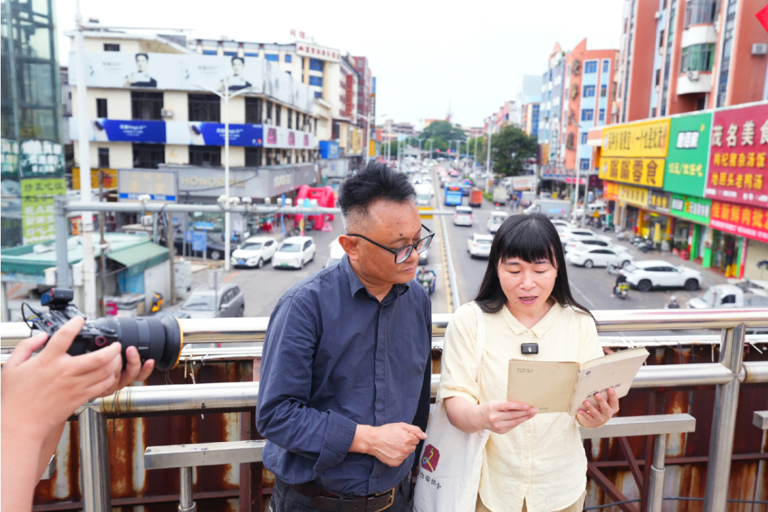郑小琼重返东坑黄麻岭,昔日打工的厂房虽几经易主,建筑轮廓却依旧熟悉。她在原地朗诵《女工:被固定在卡座上的青春》,声音未落,眼眶已湿。她坦言,许多工厂生活的细节早已模糊,但诗歌如时间胶囊,瞬间唤醒沉睡的记忆。她说:“感觉我的眼泪快要掉下来了,这大概就是诗歌的力量吧。”对她而言,黄麻岭不仅是地理坐标,更是写作的生命原乡。如今作为写作者回望,这片土地已成为观察东莞本土生活的“透镜”,透过它,她重新认识自我,也在平凡中捕捉到诗意的微光。随后,她辗转大朗,走过天桥、憩趣园、大朗图书馆,并在这些地标现场朗诵代表作,完成一场与过去对话的仪式。柳冬妩也在大朗高英村健新刺绣厂旧址追忆往昔,透露其最早发表于《诗刊》的诗歌便诞生于此,成为其进入文坛的起点。他坦言,正是这段在东莞的打工与写作经历,为其日后转向文学评论、深耕打工文学研究奠定了根基。当前,他正致力于系统梳理东莞新大众文艺现象,而莞樟路,是他研究中无法绕开的核心场域。