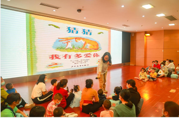“她(绘本人物)的动作代表什么?代表有很多很多。让我们一起把手张开,来表达对父母的爱也有很多很多…”捐赠仪式结束后,段利华带领着部分有意愿的儿童与家长在舞台上围坐一团,引导他们一起阅读小书包中的绘本《猜猜我有多爱你》。同时,联系绘本内容积极与儿童和家长互动,在阅读中给孩童带去欢乐、给家长带去慰藉。