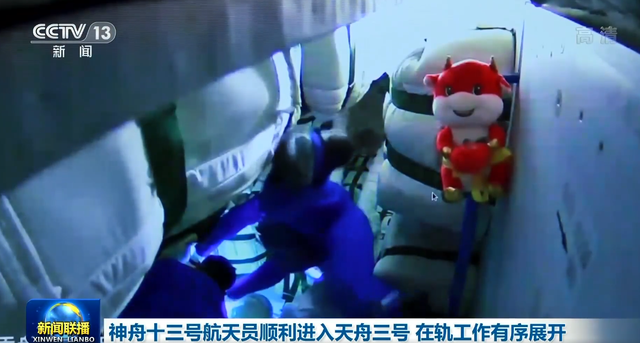今天,神舟十三号航天员成功开启货物舱舱门,进入天舟三号货运飞船。叶光富还开心地与舱壁上的牛娃娃布偶合了个影。中午12点,航天员围在一起吃午餐,下午,他们将核心舱临时存放的应急物资等转运至天舟二号存放。网友:王亚平冲天辫改丸子头了