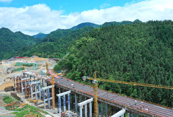 5月10日,工人在张南高速湖北省咸丰县境内一在建桥梁上施工(无人机照片)。 日前,张南高速(湖南张家界至四川南充)宣咸段(湖北宣恩县至咸丰县)控制性工程——由湖北交投建设集团承建的老山隧道和梅子垭隧道贯通,为张南高速全线贯通打下基础。 张南高速是国家高速公路项目,贯穿武陵山区,是连接湘、鄂、渝、川等中西部省市的重要快速通道,全面建成后将进一步促进湖南、湖北、重庆、四川等毗邻区域的融合发展。 新华社发(来源: 经济参考报)