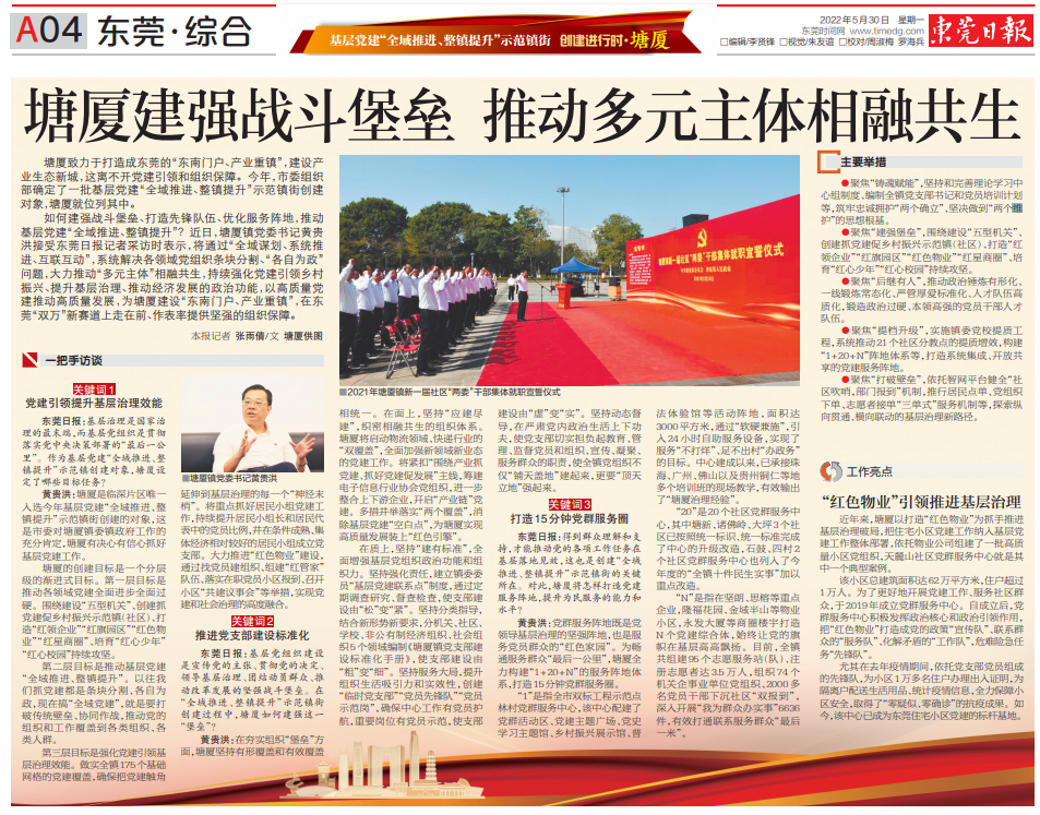 东莞日报:基层党组织建设是宣传党的主张、贯彻党的决定、领导基层治理、团结动员群众、推动改革发展的坚强战斗堡垒。在“全域推进、整镇提升”示范镇街创建过程中,塘厦如何建强这一“堡垒”?