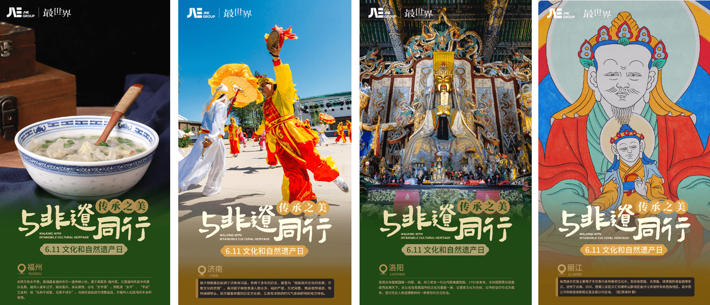 福州的美食蕴育出了佛跳墙、肉燕制作技艺,同样也有闽剧这样的地方戏剧。历史文化名城济南同样也有着商河鼓子秧歌、济阳鼓子秧歌、花鞭鼓舞、章丘蕊子等多项民间传统艺术瑰宝。同样身为十三朝古都的洛阳也拥有璀璨的非遗财富。河图洛书、玄奘传说、唐三彩烧纸技艺等数百项非遗项目传承有序,让这座古老的城市焕发着勃勃生机。丽江因多个少数民族定居于此,具有多彩的文化遗产。白沙壁画、三多节、纳西童谣、白沙细乐,东巴文化等如千年书卷在这里缓缓展开。