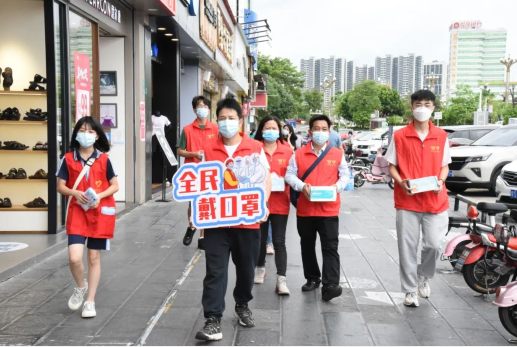 6月19日,记者在横沥镇中心区看到,身穿红马甲的志愿者们佩戴着口罩,一边举着引人注目的“全民戴口罩”提示牌,一边对来往的行人和周边的商铺派发口罩和疫情防控宣传小册子,并悉心劝导市民群众出行一定要佩戴好口罩,切实做好自身防护工作。
