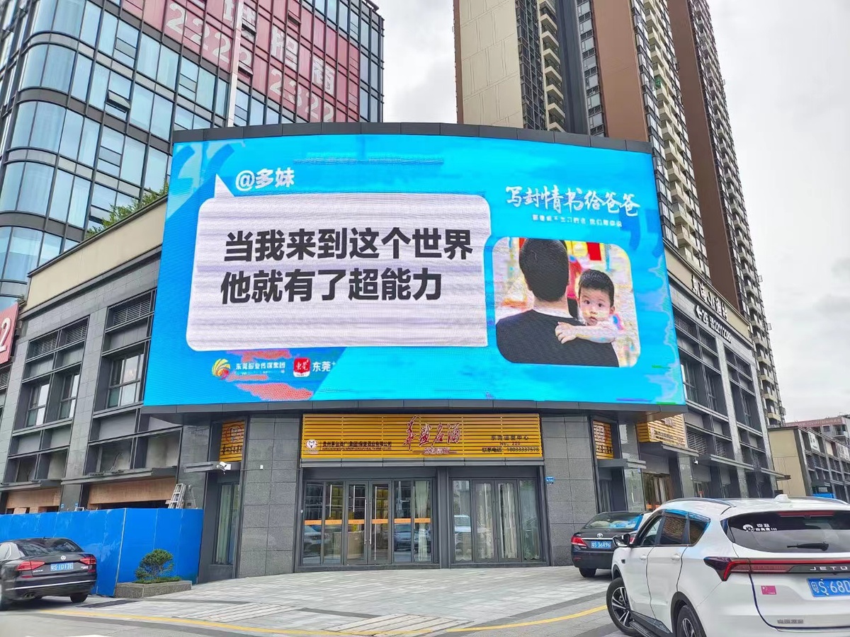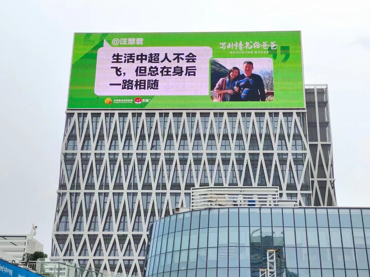 “‘累了就回家吧,我养你!’,这句话只有你是认真的”“生活中超人不会飞,但总在身后一路相随”“当我来到这世界,他就有了超能力”……今天(6月19日)是父亲节,东莞+客户端包下国贸南屏、国贸北屏、新城市酒店、中天城市广场、海德琥珀台等五块地标LED大屏,收集网友投稿,全天循环播放“炫父”表白,很多路过的人都会停下脚步,驻足欣赏。