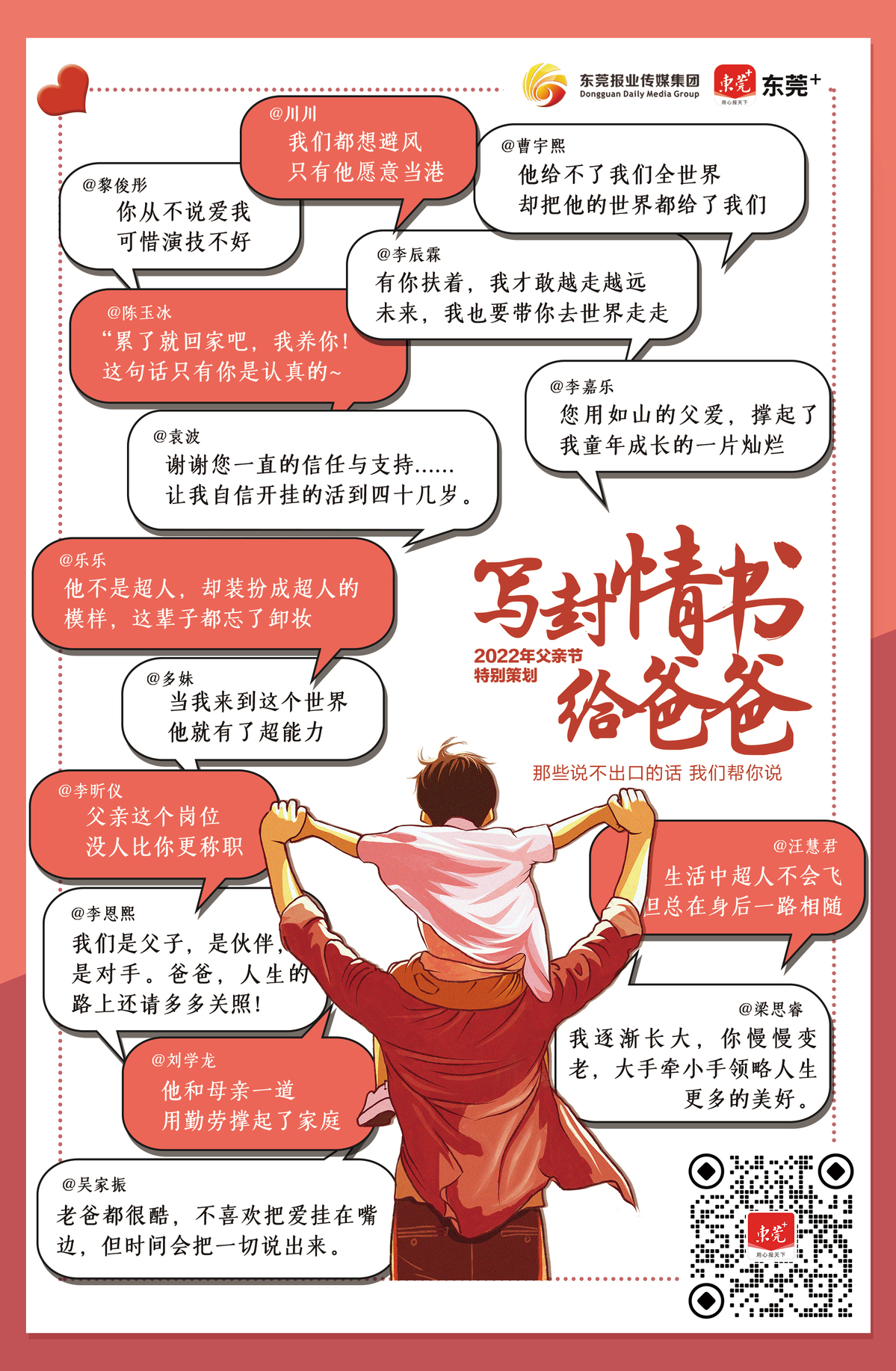 一片真心话,一张温馨照,一段暖亲情,弥足珍贵。据了解,在2022年父亲节到来之际,东莞报业传媒集团联合北京普盛食品销售有限公司东莞分公司共同举办了“写封情书给爸爸”征集点赞活动,邀请广大网友用亲情的照片,用温馨的文字,把那些平时对爸爸说不出口的爱与美好的祝福,通过一封“情书”说出来,写下来。