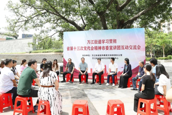 宣讲报告会结束后,市委宣讲团成员前往万江公园,与百姓宣讲团成员、群众就学习贯彻省第十三次党代会精神面对面交流,分享学习体会和感悟。互动环节上,百姓宣讲团成员就经济发展、法律援助、乡村振兴等内容展开了热烈讨论。