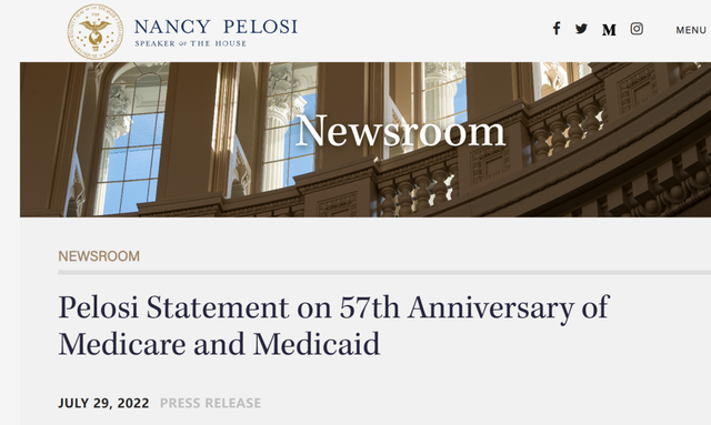 其声明称,在1965年7月30日约翰逊总统签署的联邦医疗保险和联邦医疗补助57周年纪念日到来之际,众议院议长南希·佩洛西发表声明。