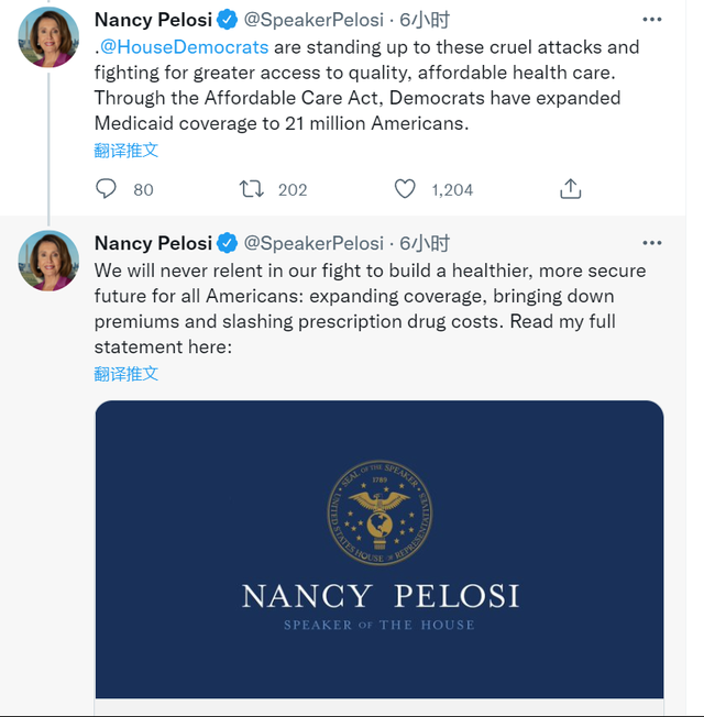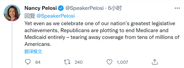 在声明中,佩罗西称赞了民主党力推的平价医疗法案,赞扬民主党人正面对抗了来自共和党的攻击,“在拜登总统对公平和正义的愿景的指导下,众议院民主党人仍然致力于实现医疗保险和医疗补助计划的基本承诺:医疗保健是一项权利,而不是特权。我们将永不松懈地为所有美国人建设一个更健康、更安全的未来而奋斗:扩大保险范围,降低保费,削减处方药成本。”