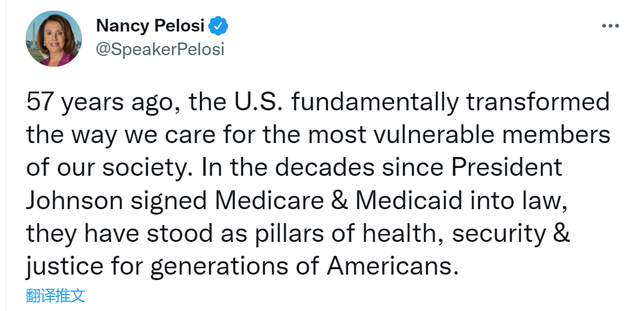 佩洛西称,“57年前,美国从根本上改变了我们照顾我们社会中最弱势成员的方式。自约翰逊总统签署医疗保险和医疗补助成为法律以来的几十年里,它们一直是美国人健康、安全和正义的支柱。然而就在我们庆祝我们国家最伟大的立法成就之一的时候,共和党人却在密谋彻底终止医疗保险和医疗补助计划——剥夺数千万美国人的医疗保险。”