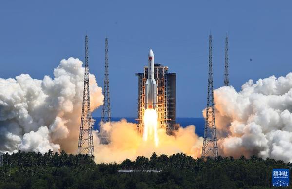 2022年7月24日,搭载问天实验舱的长征五号B遥三运载火箭,在我国文昌航天发射场点火发射。新华社记者 李刚 摄