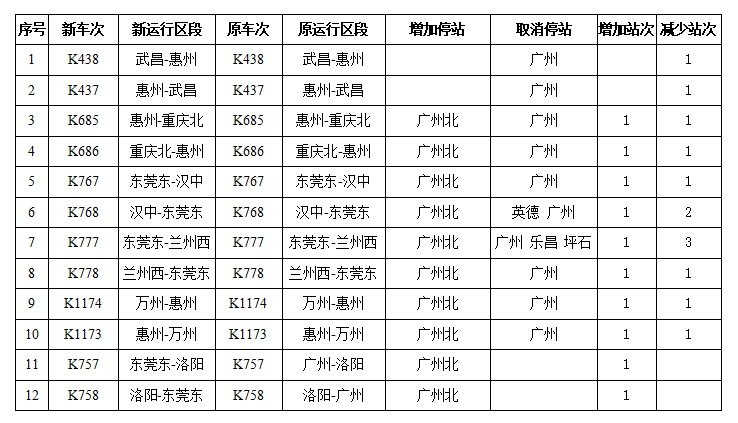 东莞东站另有12趟旅客列车停靠站将有变化,具体如下:
