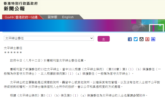 香港特区政府网站8月12日发布新闻公报称,特区政府今日于宪报刊登太平绅士委任名单。