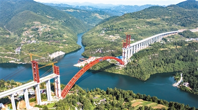 8月15日拍摄的德余高速乌江特大桥合龙现场(无人机照片)。当日,由中交一公局承建的德余高速乌江特大桥顺利合龙。(来源: 经济参考报)