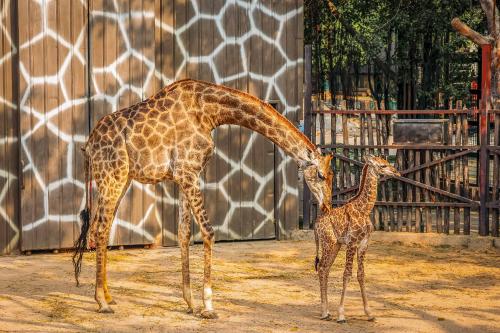 2021年4月,东莞隐贤山庄的长颈鹿馆里,拥有12年饲养经验的饲养员怀着既紧张又激动的心情,迎来了一对龙凤胎长颈鹿宝宝的顺利降生,这两只长颈鹿宝宝的妈妈都是第一胎并且最终都能够顺利生产,这在国内人工饲养长颈鹿繁育上堪称“奇迹”。经过饲养员的精心喂养和悉心照顾,两只长颈鹿宝宝得以茁壮成长,并在近日正式与广大游客正式见面。