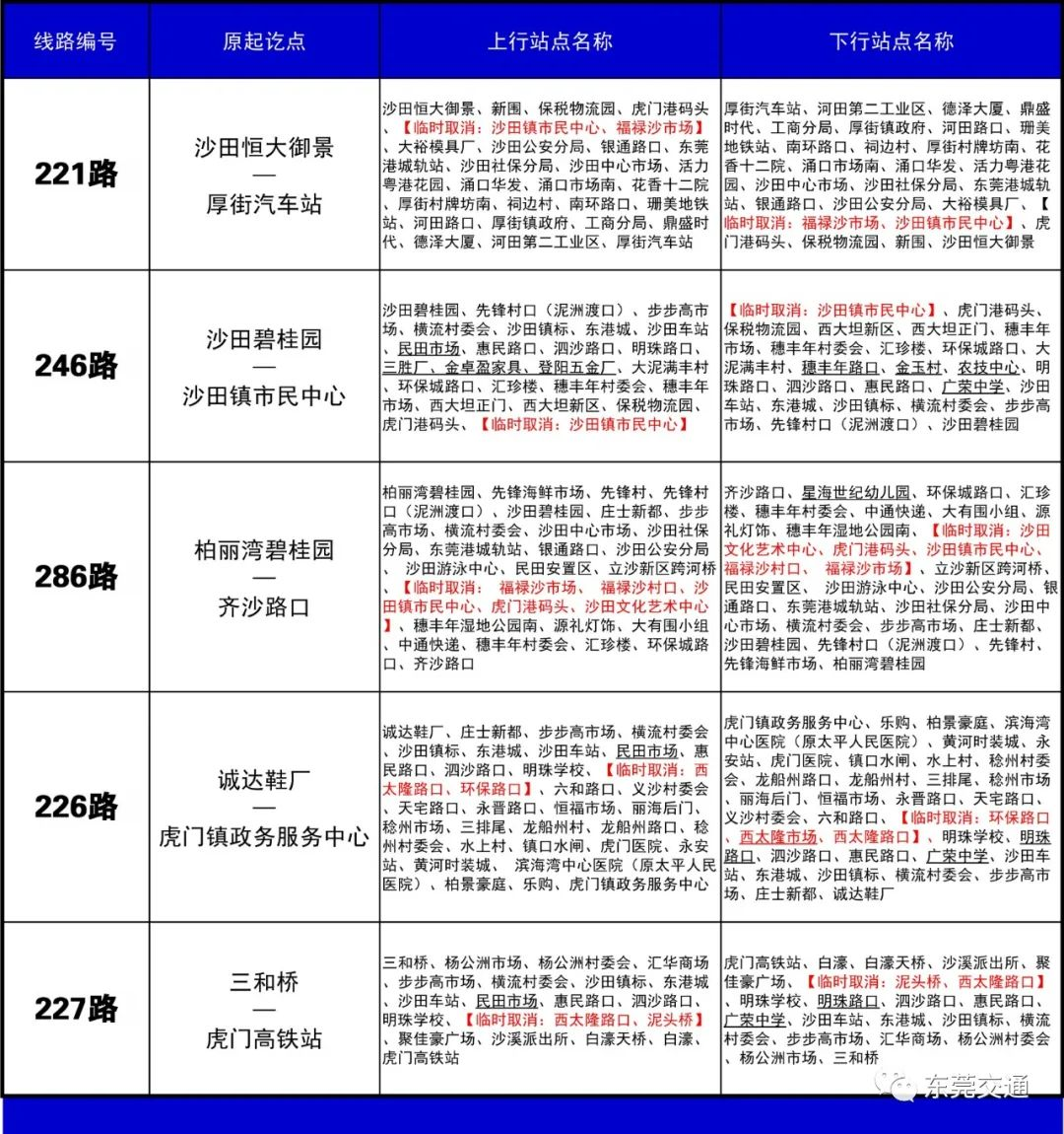 221路、246路、226路、227路、 286路临时取消停靠部分公交站点,详见下文《东莞市公交线路临时调整信息表》。