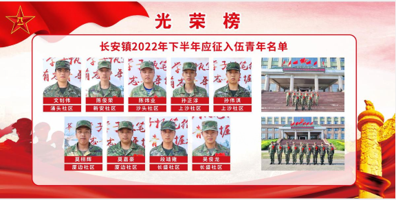 今年下半年,长安镇共有210名适龄青年应征报名,经过严格的体格检查、政治考核和役前训练,共有9名适龄青年被市征兵办批准入伍,其中大学毕业生5名、大学在校生3名、高校新生1名,大学生比例达100%,分别加入陆军、海军、空军和武警等兵种。(东莞+)