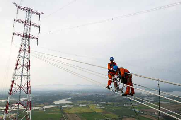 9月18日,在位于湖南省岳阳市临湘市的南荆长特高压工程螺山长江大跨越施工现场,国网山东送变电工程有限公司的工作人员调整间隔棒(无人机照片)。新华社记者 陈思汗 摄