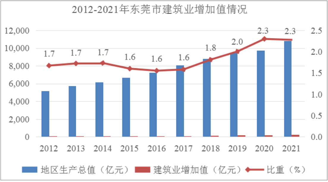 2021年,全市建筑业企业实现建筑业增加值247.56亿元,是2012年的2.8倍,2013-2021年每年增加17.85亿元。从地区生产总值的构成看,全市建筑业增加值占地区生产总值的比重呈上升态势,2021年,东莞市地区生产总值10855.35亿元,全市建筑业增加值占地区生产总值的比重为2.3%,比2012年的比重高0.6个百分点,建筑业对地区生产总值的贡献提高。