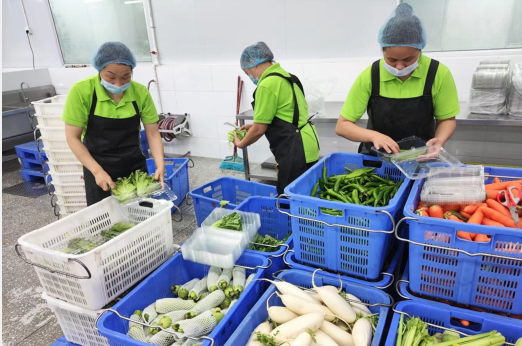 “蔬菜有辣椒、菜心、生菜、上海青、土豆、西红柿、小瓜等,肉类有鲜肉、排骨、鸡。除此之外,油、大米、面条、酱油等也有供应。”该企业采购部经理陈宇介绍道:“我们的物资供应齐全,价格也比市场优惠,像一份生菜,市场销售价格是每斤2元,我们只需要每斤1.5元,在保证实惠同时,也保证了物资供应充足。”