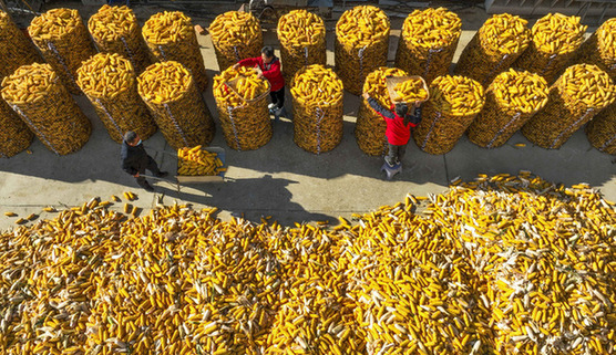 10月9日,河北省遵化市刘备寨乡农民将收获的玉米装入粮囤(无人机照片)。