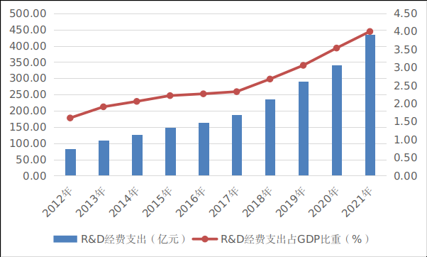 图1 2012-2021年东莞全社会R&D经费支出和投入强度