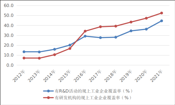 图2 2012-2021年规上工业企业设立研发机构和有R&D活动覆盖率