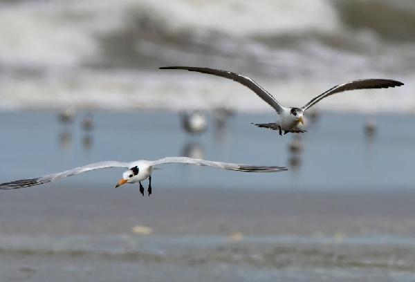 中华凤头燕鸥(左)和大凤头燕鸥在闽江河口国家湿地公园里翱翔觅食。新华社记者 魏培全 摄