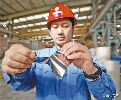 在中国宝武太钢不锈钢精密带钢有限公司,一名工作人员展示“手撕钢”。作为一种高端材料,“手撕钢”在航空航天、高端电子、通信等行业都发挥着重要作用。目前该公司生产的“手撕钢”厚度仅0.015毫米,为全球最薄。