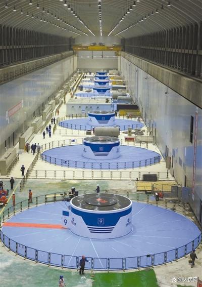 白鹤滩水电站共安装16台我国自主研制、全球单机容量最大的百万千瓦水轮发电机组,左右两岸各布置8台,是当今世界在建规模最大、技术难度最高的水电工程。图为白鹤滩水电站右岸地下厂房。