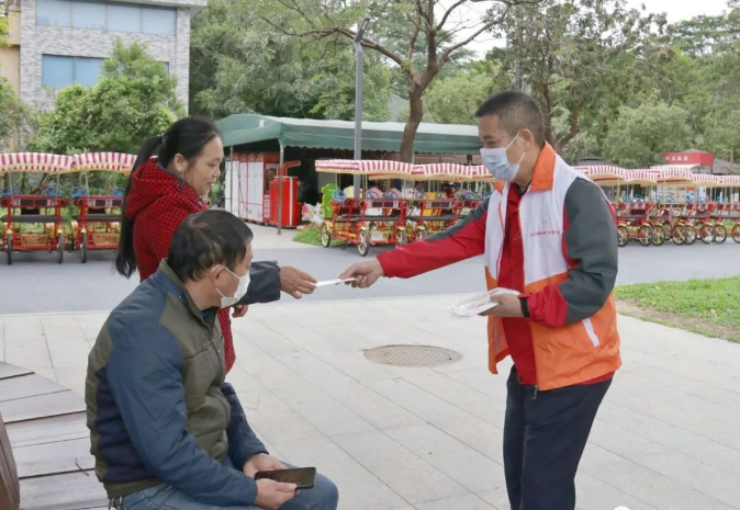 记者近日在东坑农业园看到,志愿者们手持宣传牌,向正在游园的市民们一边免费派发口罩,一边叮嘱市民外出时要佩戴口罩,积极做好个人防护,倡导市民要树立起“每个人都是自己健康的第一责任人”意识,共同守护美好健康生活。