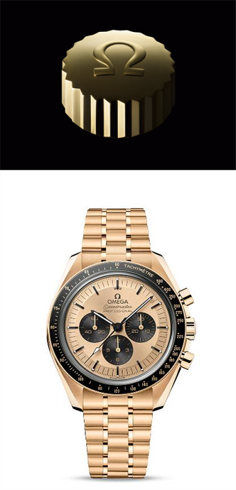 而Moonshine 18K金则是欧米茄凝聚了诸多冶金学家、工艺专家和科学家的智慧,采用金、铜、银和钯的混合比例,打造出月光般的全新色调,比传统的黄色18K金颜色更柔和复古,并且更耐腐蚀,色泽更持久。