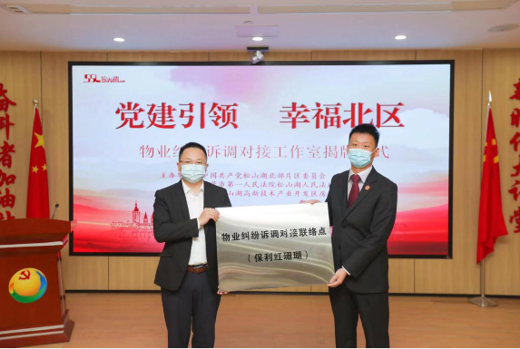 活动现场,松山湖北部片区党委、松山湖法庭、松山湖房管所三方代表共同签署《诉调对接机制合作协议》,并为松山湖北部片区物业纠纷诉调对接工作室(以下简称物业诉调工作室)揭牌。松山湖保利红珊瑚小区、金域松湖小区作为物业纠纷诉调对接的联络点。现场邀请了北部片区物业公司代表、保利红珊瑚小区、金域松湖小区党支部及居民代表等参加本次活动。