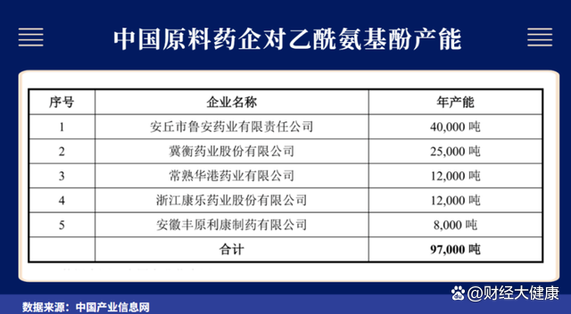 中国产业信息网数据显示,目前中国最大的对乙酰氨基酚生产商为鲁安药业公司,产能4万吨。2022年7月提交上市申报稿的冀南药业是其主要竞争对手,产能2.5万吨,另有两家产能过万企业。前述丰原药业旗下利康制药,录得产能8000吨,当前实际产量5000吨。