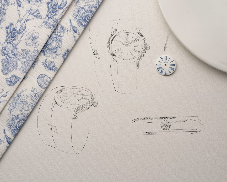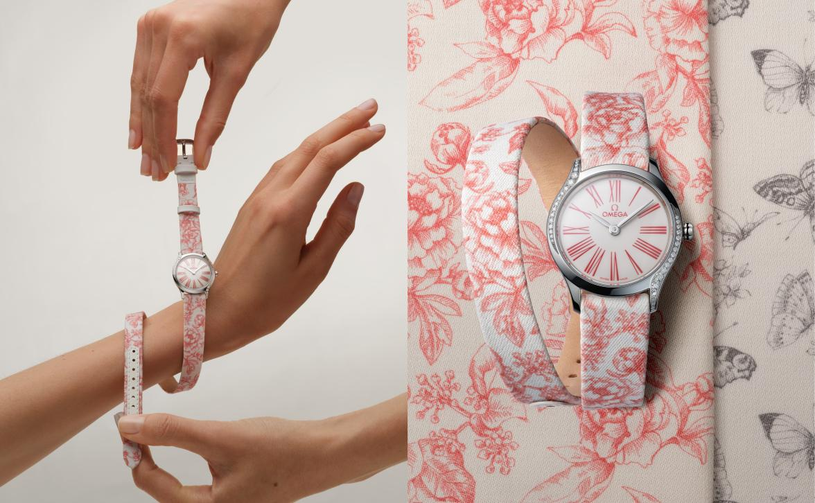 欧米茄从历史上运用在壁毯和瓷器上的茹伊印花图案中汲取灵感,设计并推出三款风格独特的“茹伊印花”表带,每一款表带的图案均与欧米茄品牌基因息息相关。其中,蓝色海洋元素致敬欧米茄与深海探索的深厚情缘,黑色蝴蝶图案象征着欧米茄支持人类航空航天探索的传奇历史,红色花卉图案则彰显品牌对保护地球家园的不竭热忱。