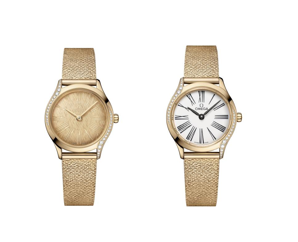 全新名典腕表包含两款由Moonshine 18K金打造的腕表,闪耀迷人。其中一款腕表的表壳、表链、指针、小时刻度甚至饰有丝绸纹理的表盘均由欧米茄独家研发的Moonshine 18K金制成,浑然一体。另一款则搭配由“大明火”工艺制成的米白色珐琅表盘,饰以经黑化处理的罗马数字刻度,对比鲜明。