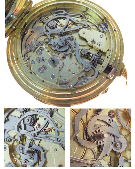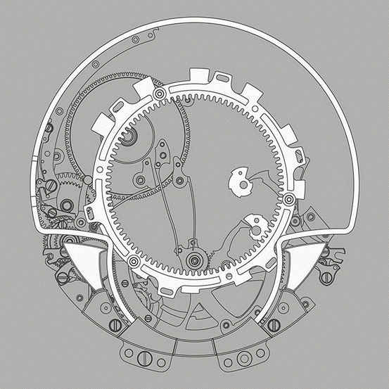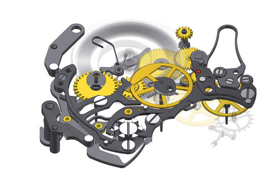 另一方面在于计时轮系的动态属性,我们知道,计时需由杠杆将计时轮压向走时轮,啮合后启动。要在动态的计时轮系上添加时间记忆蜗形轮,并能与读时系统完美啮合,对各功能的精准度提出了新要求。